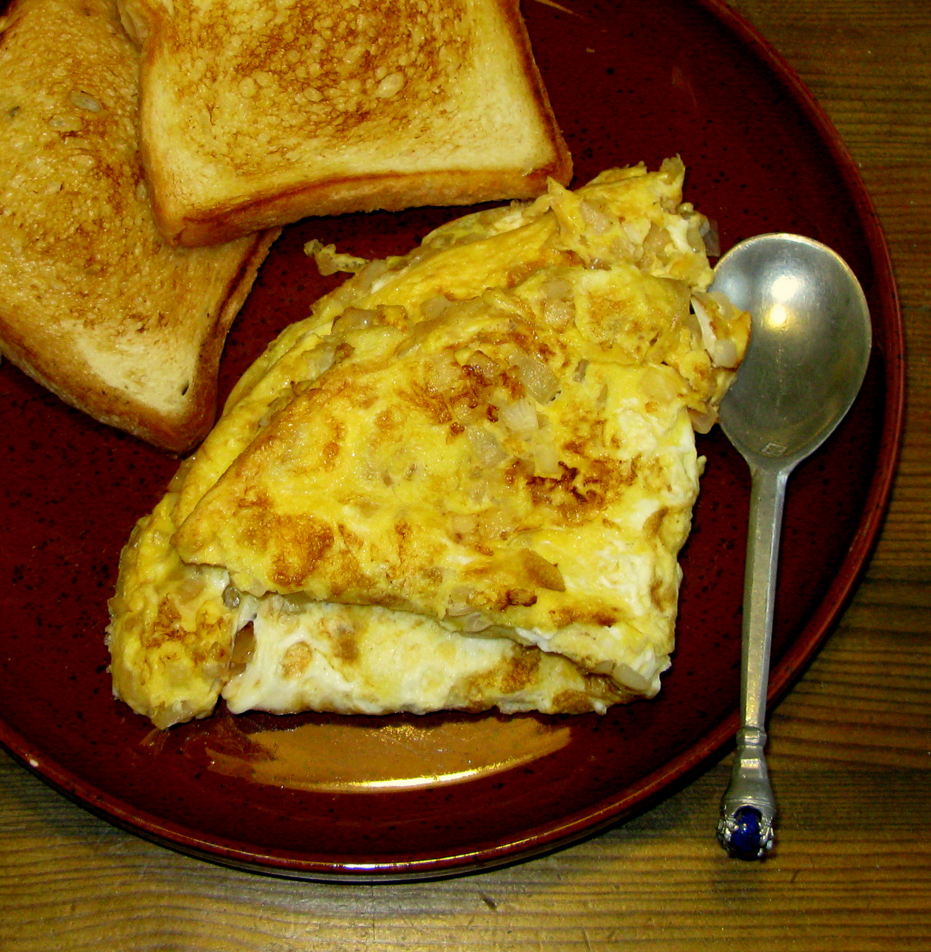 Melt the butter in the pan. Beat the eggs in a bowl and add salt and pepper to taste. Fry the onions till tender and golden brown. Add beaten eggs and lower the temperature little bit. Carefully stir the eggs little bit and then let it cook. Cook until the eggs have set on the top and the bottom is golden brown. Fold the omelette in half and serve. This recipe is for 1-2 people.