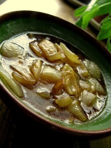 Chop the onions, not too small and not too big. I say spoonful size. Put water to boil and add some salt. Add the onions to boiling water and parboil them for a couple of minutes. Then discard the liquids and let the onions dry. Fry the onions in olive oil until golden brown. Put the fried onions to the pan and add ale and a small pinch of saffron and salt to taste. Cook for 15 minutes to one hour. Serve with dried bread cubes or slices.
