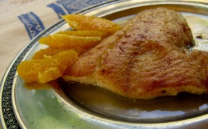 Dry fillets on paper towel etc. Make fresh orange juice from one of the oranges. Leave the other one for garnishing if you want. Sprinkle salt on each side of fish fillets (as much as you want) and dipp them to the flour. Heat a skillet and olive oil and fry fillets on moderate heat/fire depending on the size of the fillets as long as they are done (about 3-5 minutes on each side). Garnish with fresh orange juice and orange slices. Serve hot.