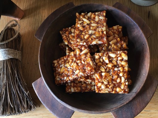 Mix together sugar and honey in a pot and put it on a moderate heat. Keep stirring the mixture so it will not burn. Be careful not burn yourself with the mixture. Let it boil for awhile until the mixture reaches the soft ball stage which means the mixture become light and foamy with lots of small air bubbles. Then take it of from heat and mix in pine nuts and ginger. Then pour the mixture on a baking sheet or watered/ oiled surface. Let it cool and break. Serve with fried meat or fish like the original recipe suggests or eat it as it is.
