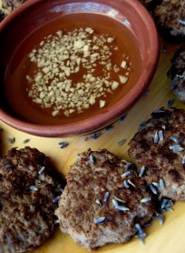 This is the recipe used by Sayyid Abu al-Hasan and others in Morocco, and they called it isfîriyâ. Take red lamb, pound it vigorously and season it with some murri naqî*, vinegar, oil, pounded garlic, pepper, saffron, cumin, coriander, lavender, cinnamon, ginger, cloves, chopped lard, and meat with all the gristle removed and pounded and divided, and enough egg to envelop the whole. Make small round flatbreads (qursas) out of them about the size of a palm or smaller, and fry them in a pan with a lot of oil until they are browned. Then make for them a sauce of vinegar, oil, and garlic, and leave some of it without any sauce: it is very good.