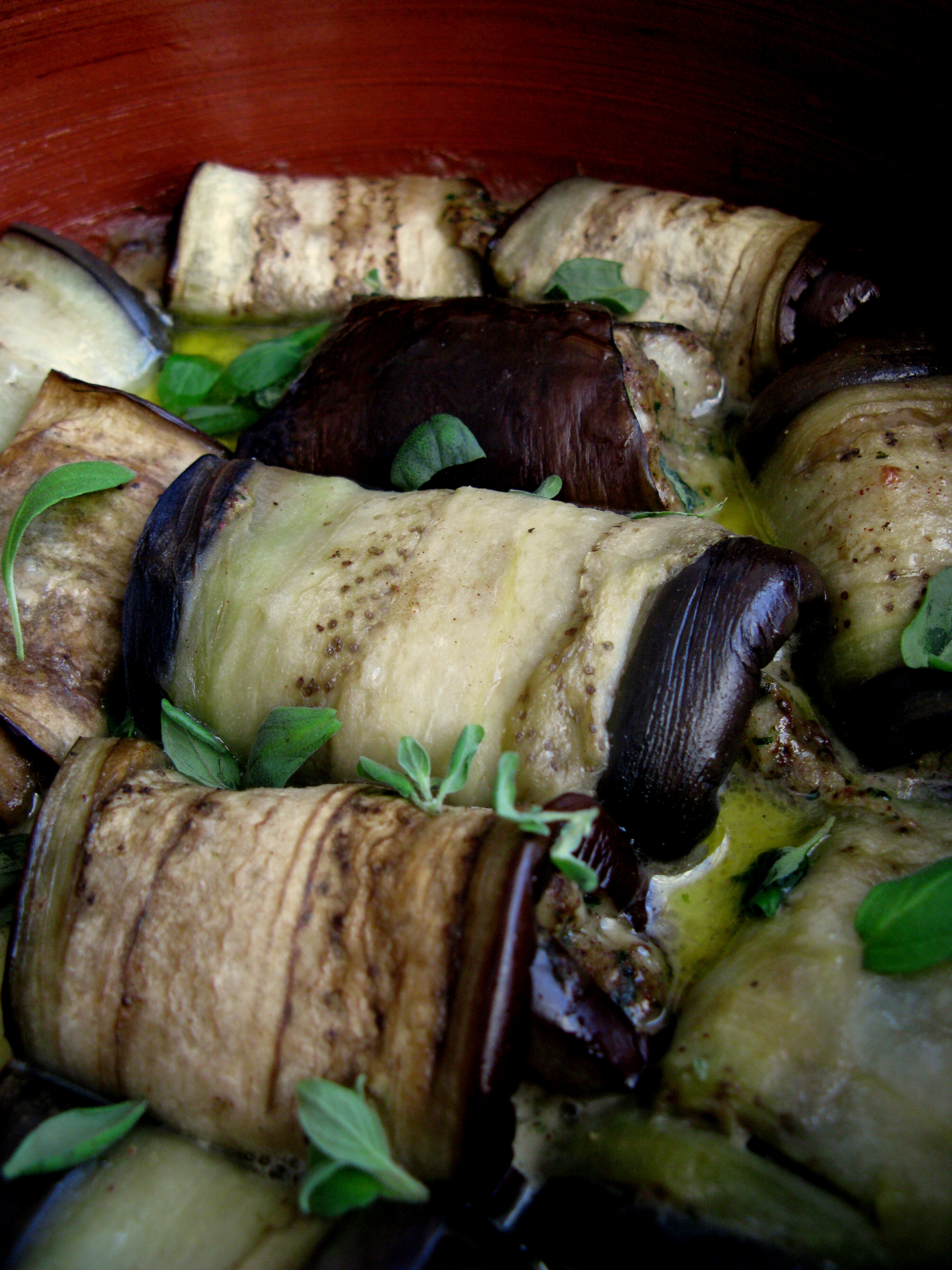 - Laita uunivuoan pohjalle leikattuja sipulirenkaita. Levitä täytettä munakoisoviipaleelle ja rullaa viipaleet rullaksi.