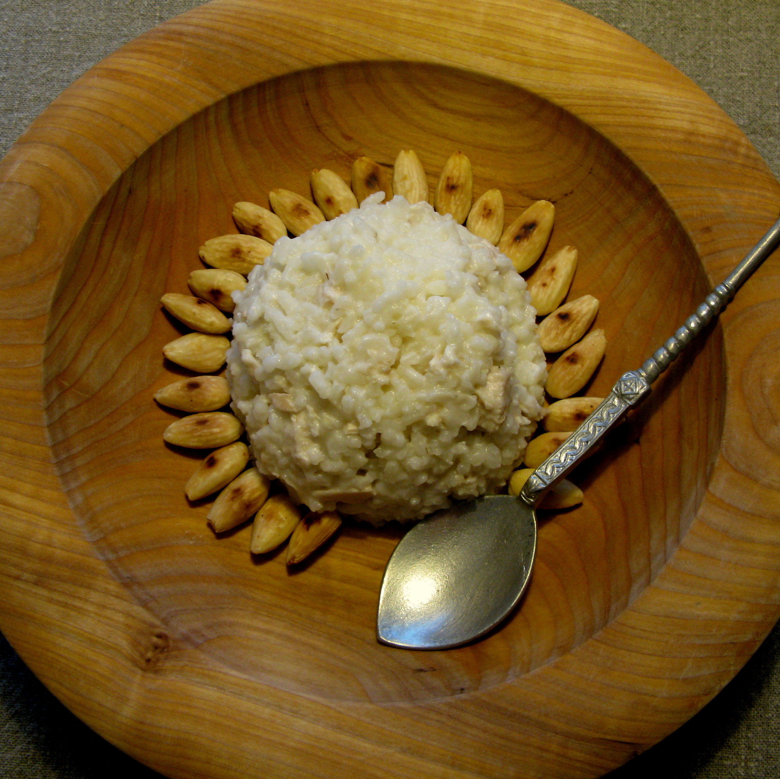 Tee mantelimaito perusreseptissä olevan ohjeen mukaan. Lisää kypsän riisin joukkoon kattilaan n. 4 dl mantelimaitoa ja keitä hiljaisella tulella noin 20 minuuttia. Lisää tarvittaessa vettä tai mantelimaitoa. Lisää sokeri, suolaa ja kananpalat ja keitä vielä noin 10 minuuttia. Koristele annos manteleilla ja tarjoile.