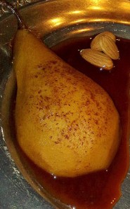Tee viinisiirappi siten, että laita kattilaan puolipullollista viiniä ja kanelia ja sokeria ja keitä hiljaisella tulella, kunnes puolet nesteestä on haihtunut pois. Kuori päärynät ja keitä niitä kokonaisina 5-10 minuuttia kiehuvassa sokerilla maustetussa vedessä, kunnes päärynät ovat lähes kypsiä. Halkaise päärynät kahtia ja laita ne siirappiin. Lisää vielä hieman inkivääriä ja sahramia päärynöihin ja kuumenna.