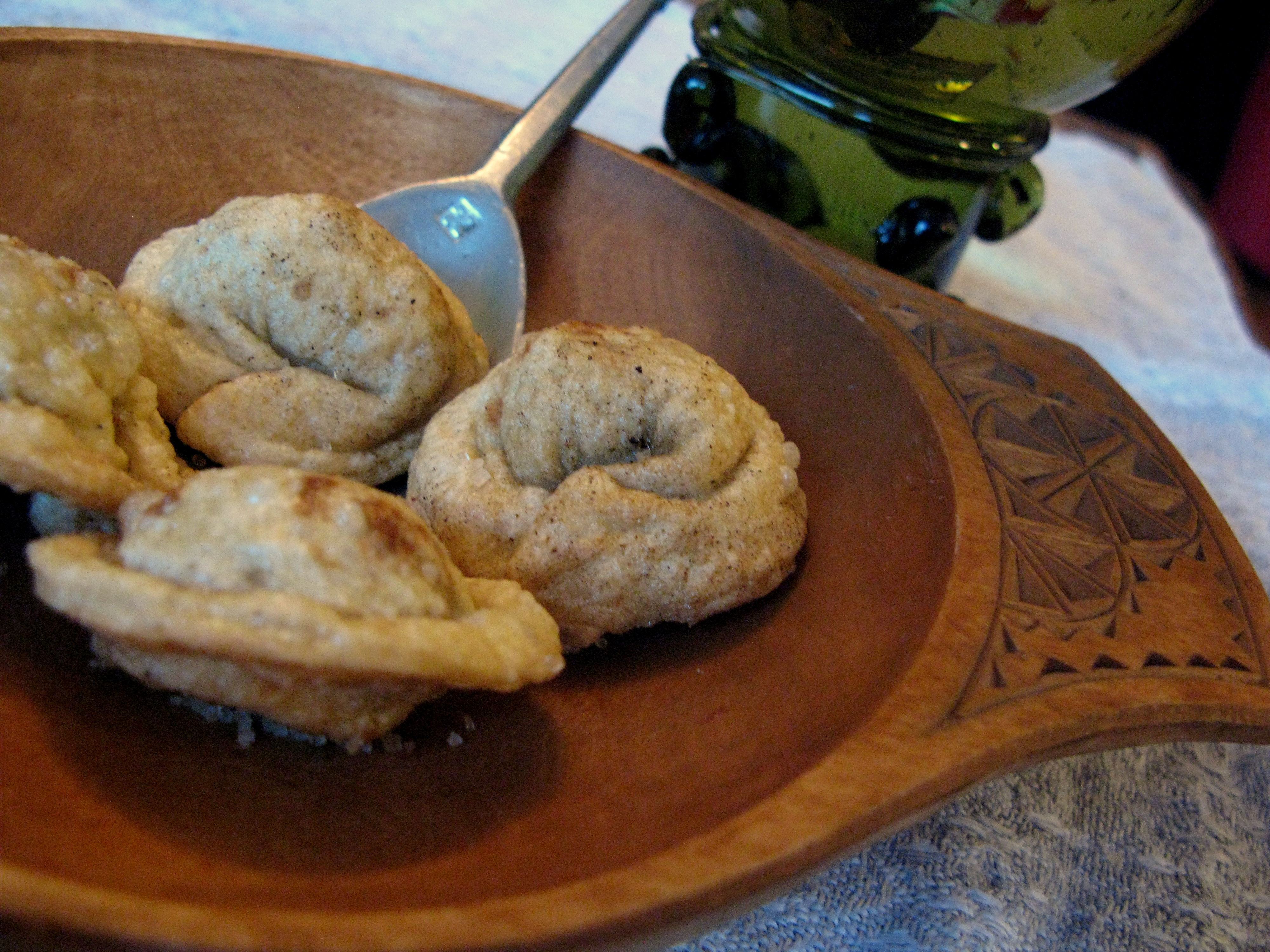 Take flour and eggs & knead together / take figs, raisins & dates & put out the stones & blanched almonds & good powder & bray together / make coffins of the length of a span / put thy stuffing therein, in every cake his portion/ fold them & boil them in water & afterward roast them on a griddle & give forth.